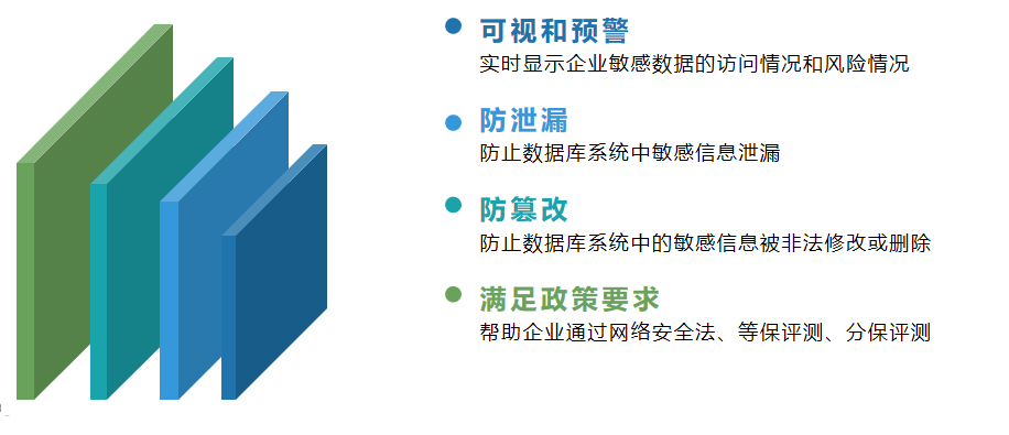 对访问进行过滤,阻断异常的查询和访问,防止敏感数据泄漏;阻断异常的和违规的数据修改、删除操作,防止敏感数据被非法篡改。
